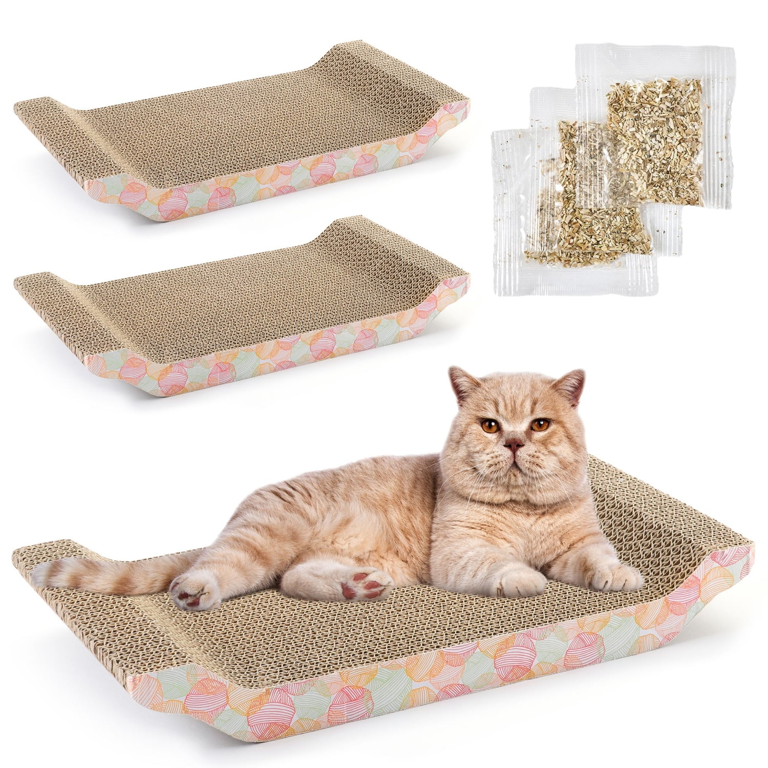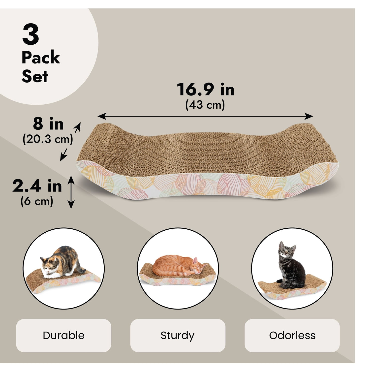 - Complete Scratch Set: This bulk set includes 3 cardboard cat scratchers and 3 bags of catnip, perfect for placing around your home. Give your kitty plenty of places to scratch and lounge while keeping your furniture protected from claws