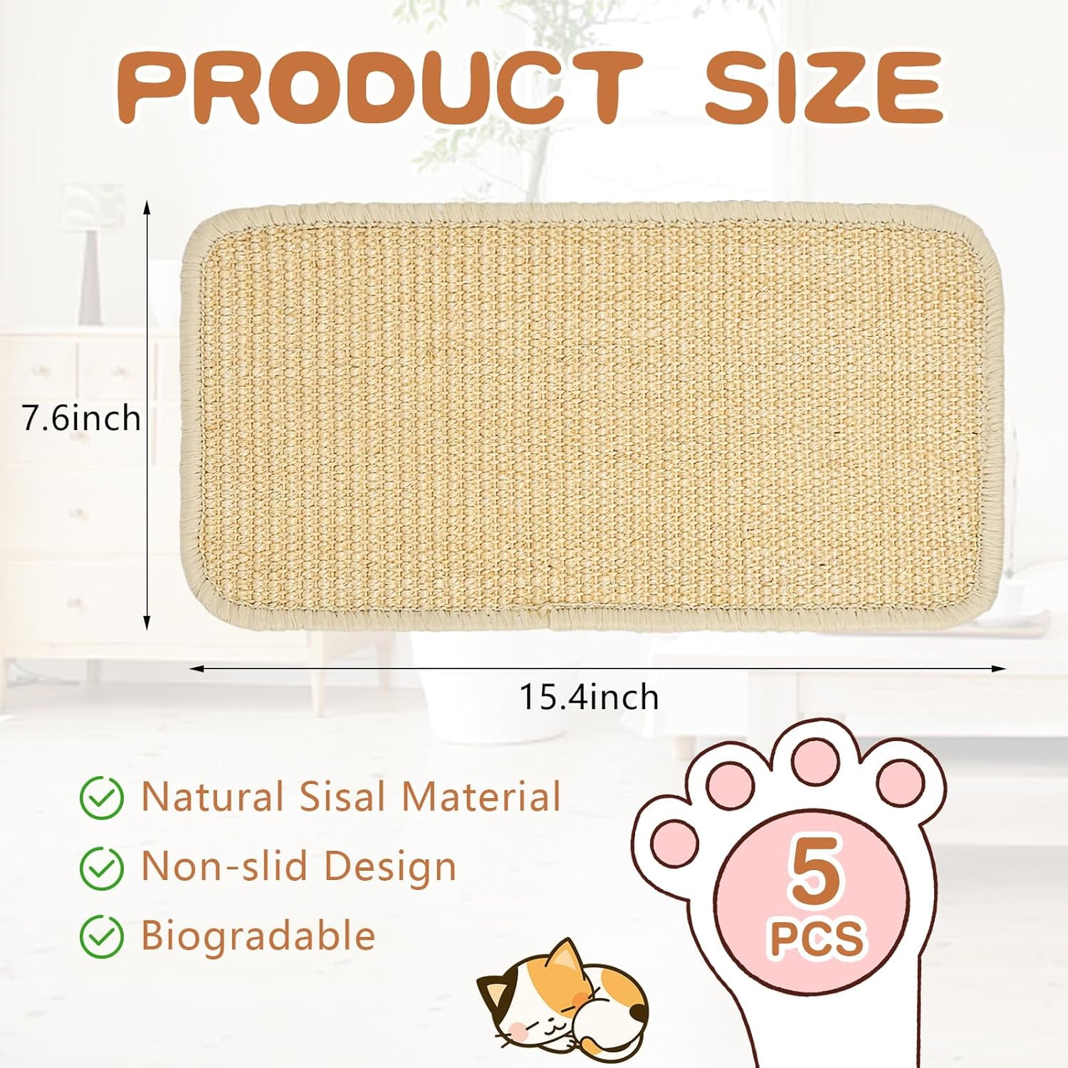 5Pcs Cat Scratcher Mat, Natural Sisal Cat Scratching Pad with Adhesive Loop Tape, Cat Scratch Furniture Protector Rug for Indoor Cats to Protect Wall Couch Bed Carpets 15.4×7.6In