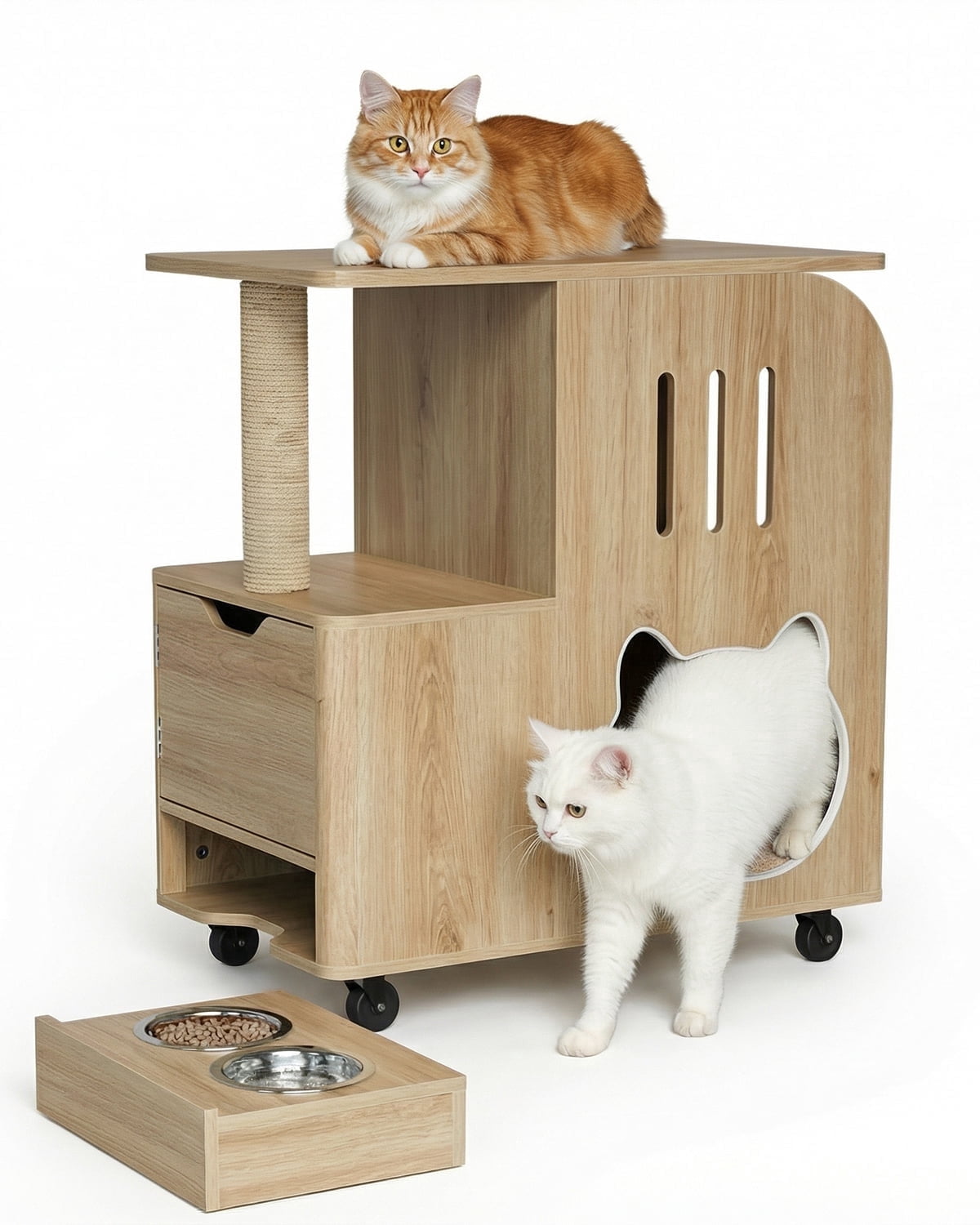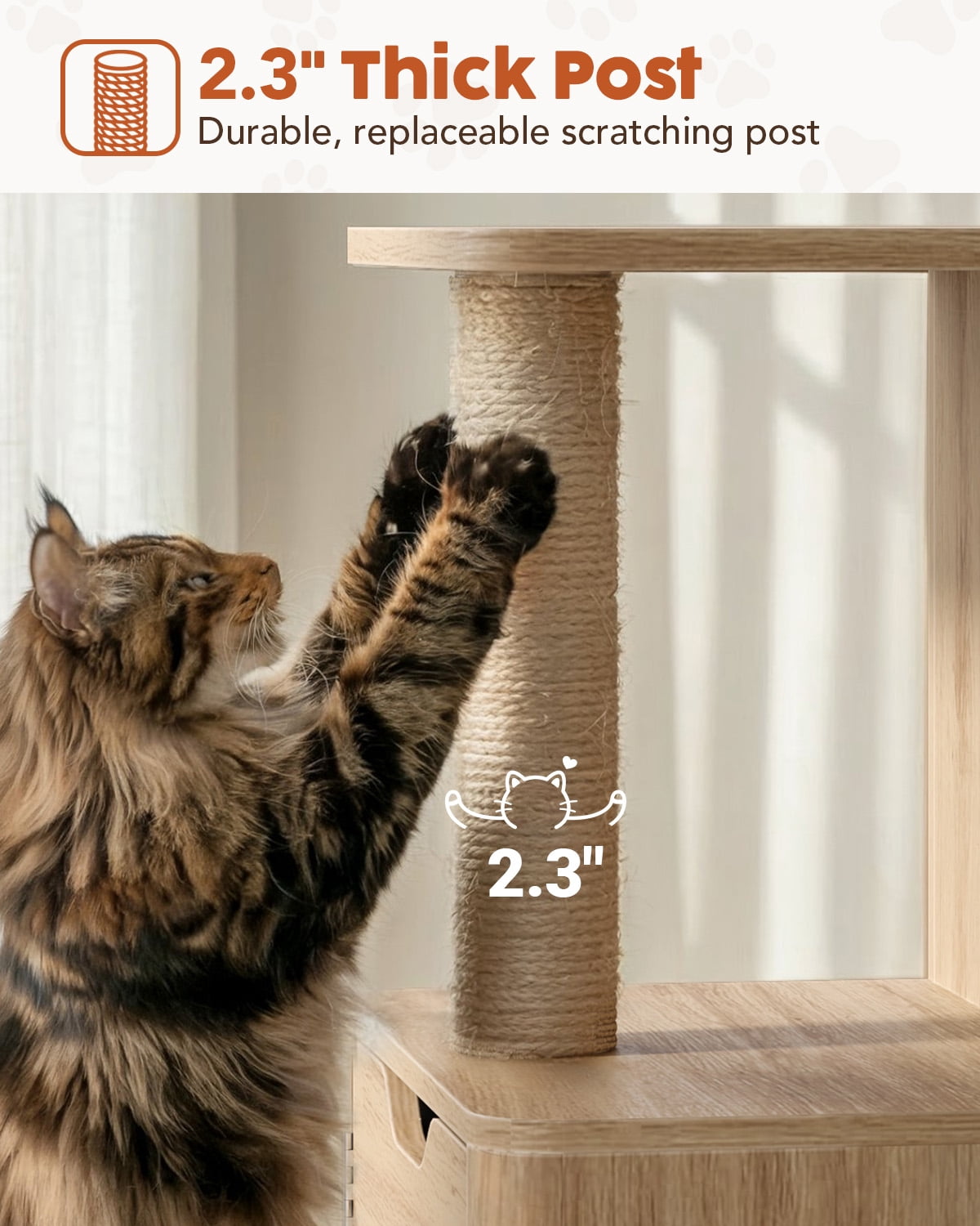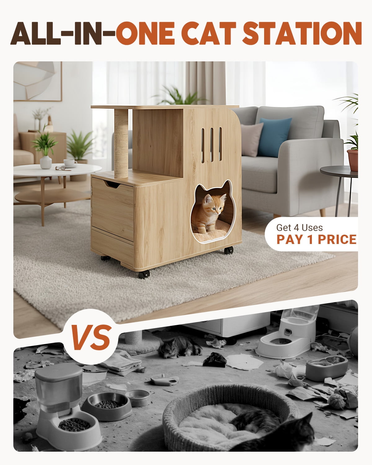 - [Fun Play & Space-Saving] Featuring a durable scratching post and multi-tier vertical layout, this unit acts as a cat tower with food station where cats can sun, lounge, dine, play, and store essentials in one footprint. Perfect for maximizing small rooms and protecting your furniture while meeting natural scratching instincts.