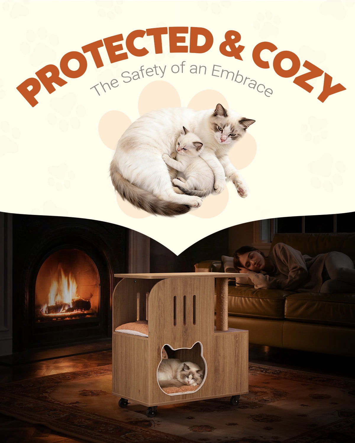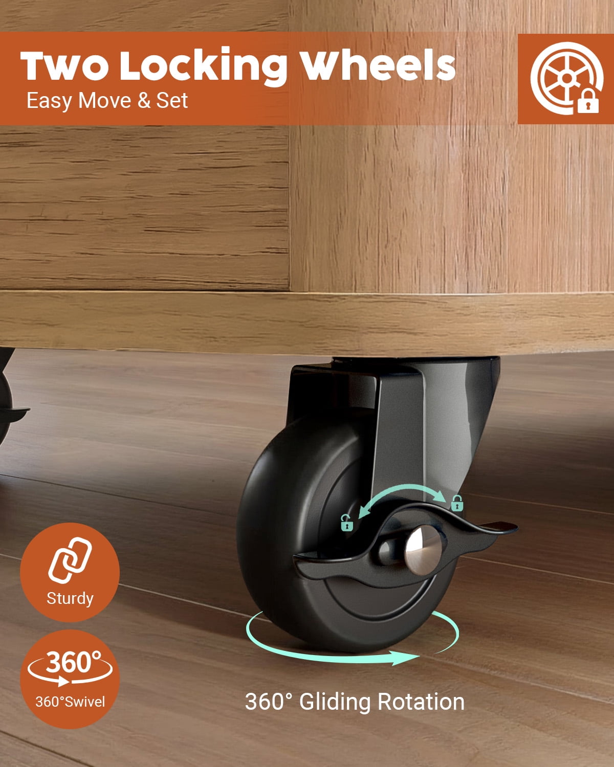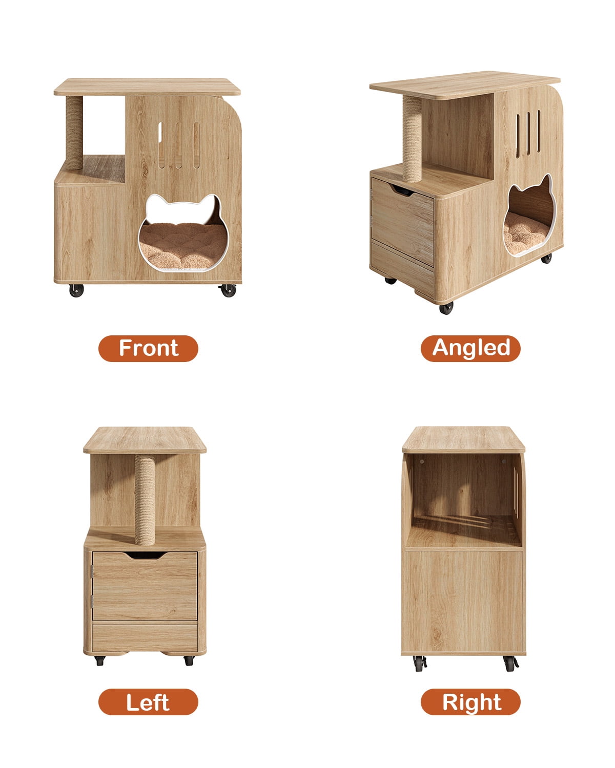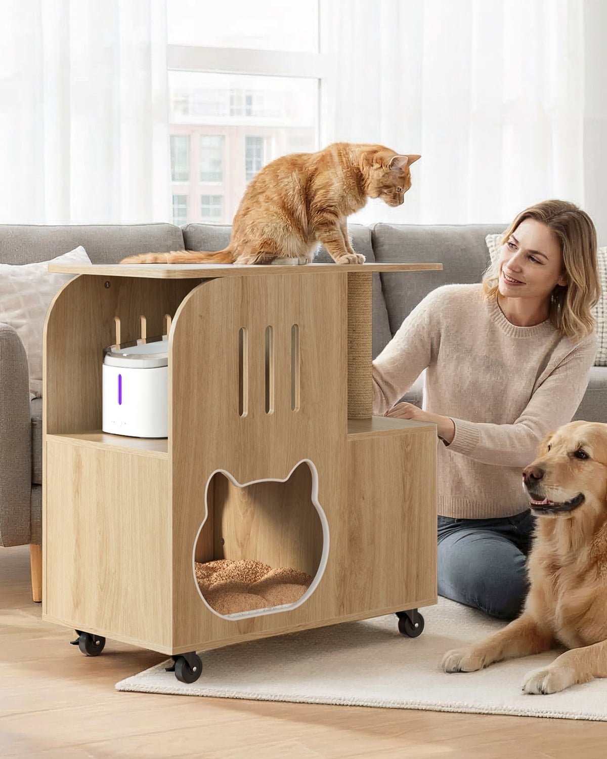 - [Move anywhere with 360° Wheels] This mobile cat cabinet glides smoothly on 360° silent universal wheels, allowing effortless movement anywhere—sofa side, window, or bedroom. Two lockable wheels keep it stable. Ideal for cleaning, sunbathing time, or keeping your cat close while you relax.