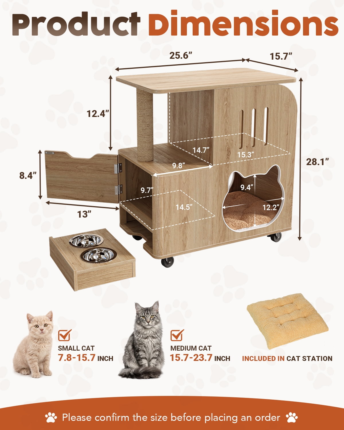 - [All-in-One Mobile Cat Cabinet] This all-in-one dog proof cat feeding station doubles as a cat tree with storage and compact pet food storage cabinet. Measuring 25.6″L × 15.7″D × 28.5″H (39.1 lbs), it combines sleeping, lounging, dining, playing, and hiding in one unit. The top serves as a sunny perch, the middle offers a scratching post and open rest zone, and the bottom includes a closed storage cabinet plus a cozy cat-shaped hideaway—ideal for multi-cat homes.