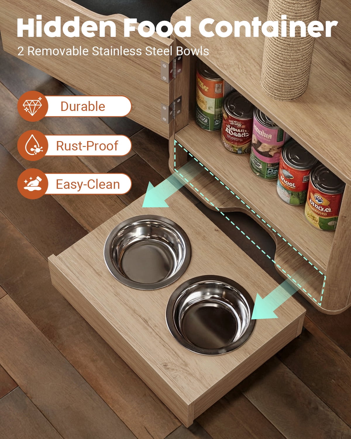 - [Built-In Hidden Feeding Station & Storage] This dog proof cat feeder is designed to function like a compact cat table, this pull-out feeding drawer keeps meals organized and dog-proof, working as a neat pet feeder station. It includes 2 stainless steel bowls to prevent spills and keep water and kibble in one place, while the enclosed design stops bowls from sliding and keeps food safely away from dogs.