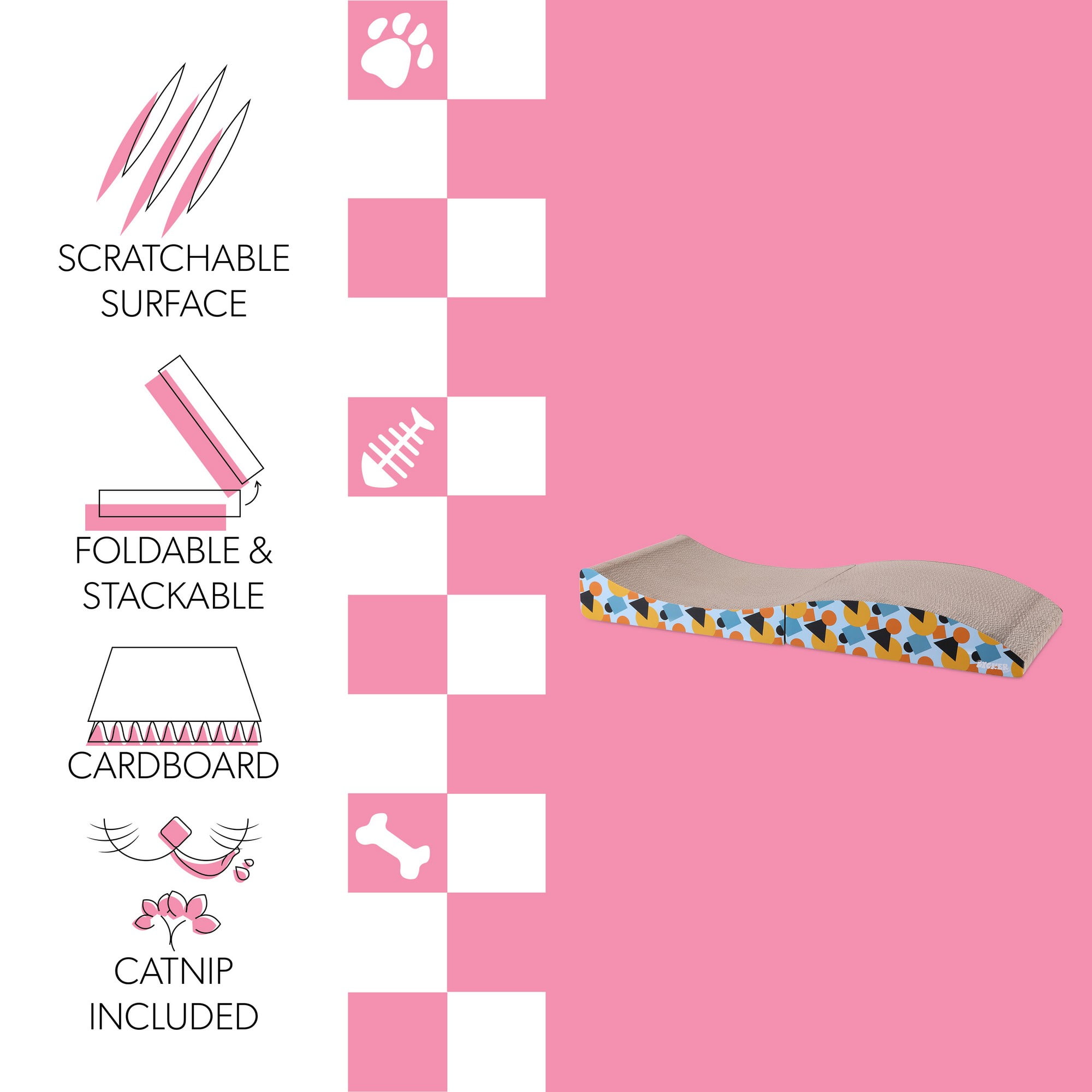 - Versatile design can be stacked, laid flat, or separated to create two scratching areas