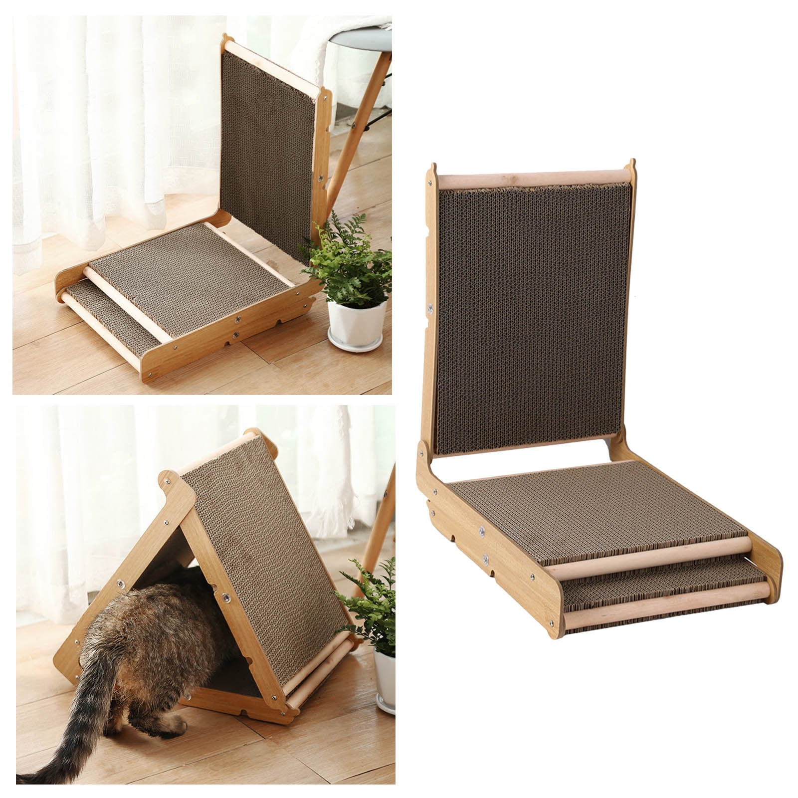 - -Angle Foldable Cat Scratcher. This cardboard cat scratcher features built-in hinges and locking clips, allowing you to fold and shape it into various configurations. The foldable cat scratcher can stand vertically, horizontally, or form angles to suit your preferences.