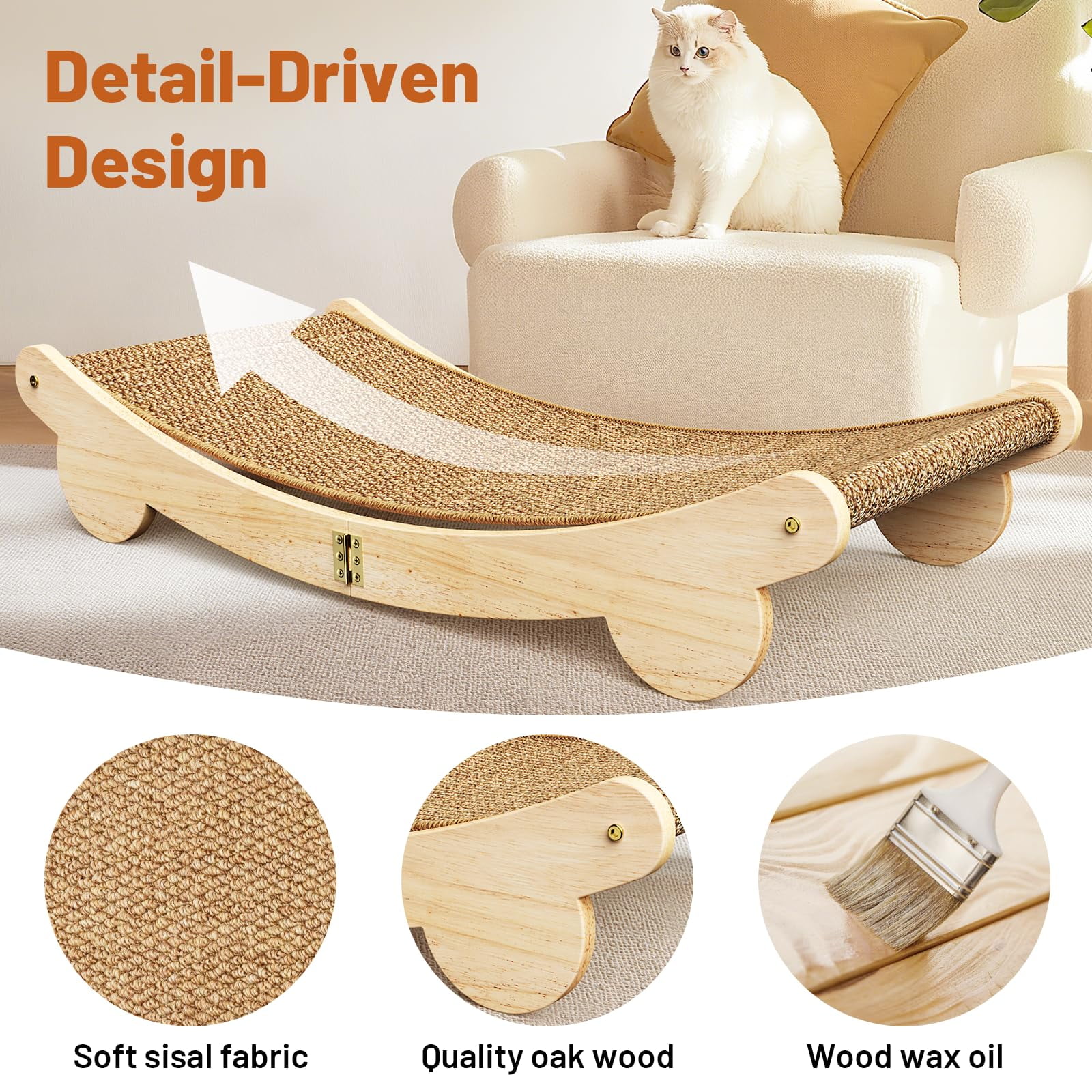• Blends In Beautifully – With its minimalist wood finish and stylish shape, this cat scratcher fits right into any space—living room, bedroom, or even the garden patio. It’s not just cat furniture, it’s decor you’ll love and a lounging spot your cat won’t want to leave