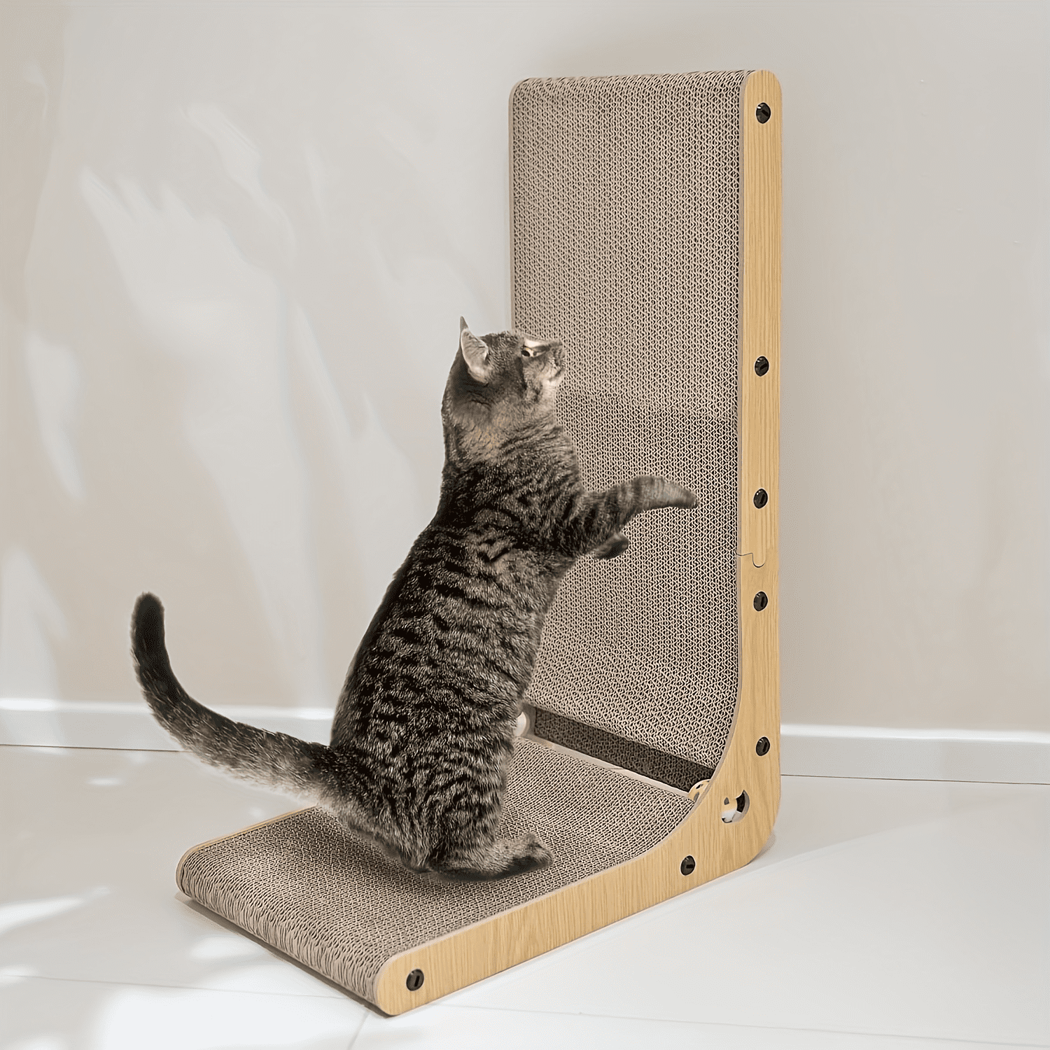 • ‌Aligns with cats’ natural instincts – the cat scratcher becomes their exclusive favorite. Crafted with cat-loved corrugated cardboard, this cardboard cat scratcher features natural textured surfaces that easily stimulate their inherent scratching instinct. Its L-shaped cat scratcher design balances standing scratching and lying relaxation, encouraging cats to leave furniture behind and claim this as their exclusive “playground.”