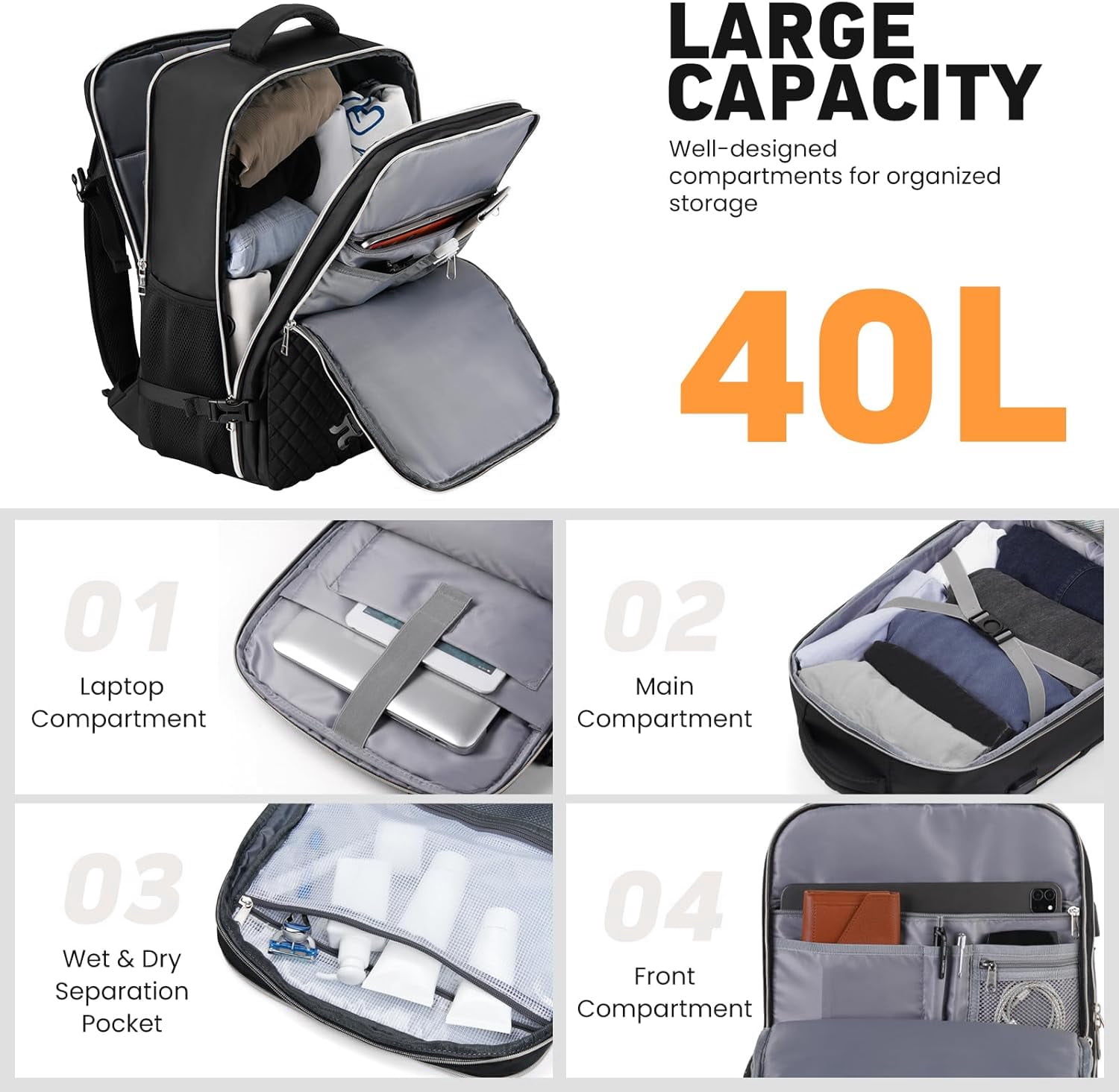 - Spacious Capacity: Features a 40L capacity (19 x 13 x 7.8 inches, 2.1lb) with a padded compartment for a 17″ laptop and 12.9″ iPad, a main compartment for 5-8 pieces of clothing, and a front compartment with multiple pockets.