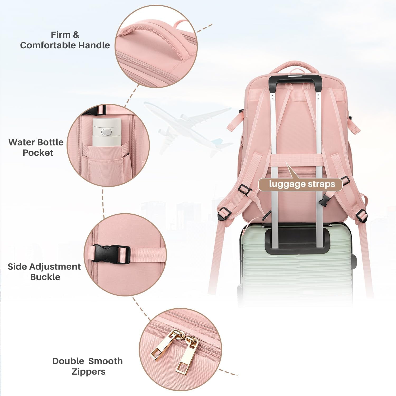 - Versatile Functionality: Offers a wet layer for toiletries, top handles, a side pocket for a water bottle or umbrella, a luggage strap, and a hidden anti-theft pocket for valuables.