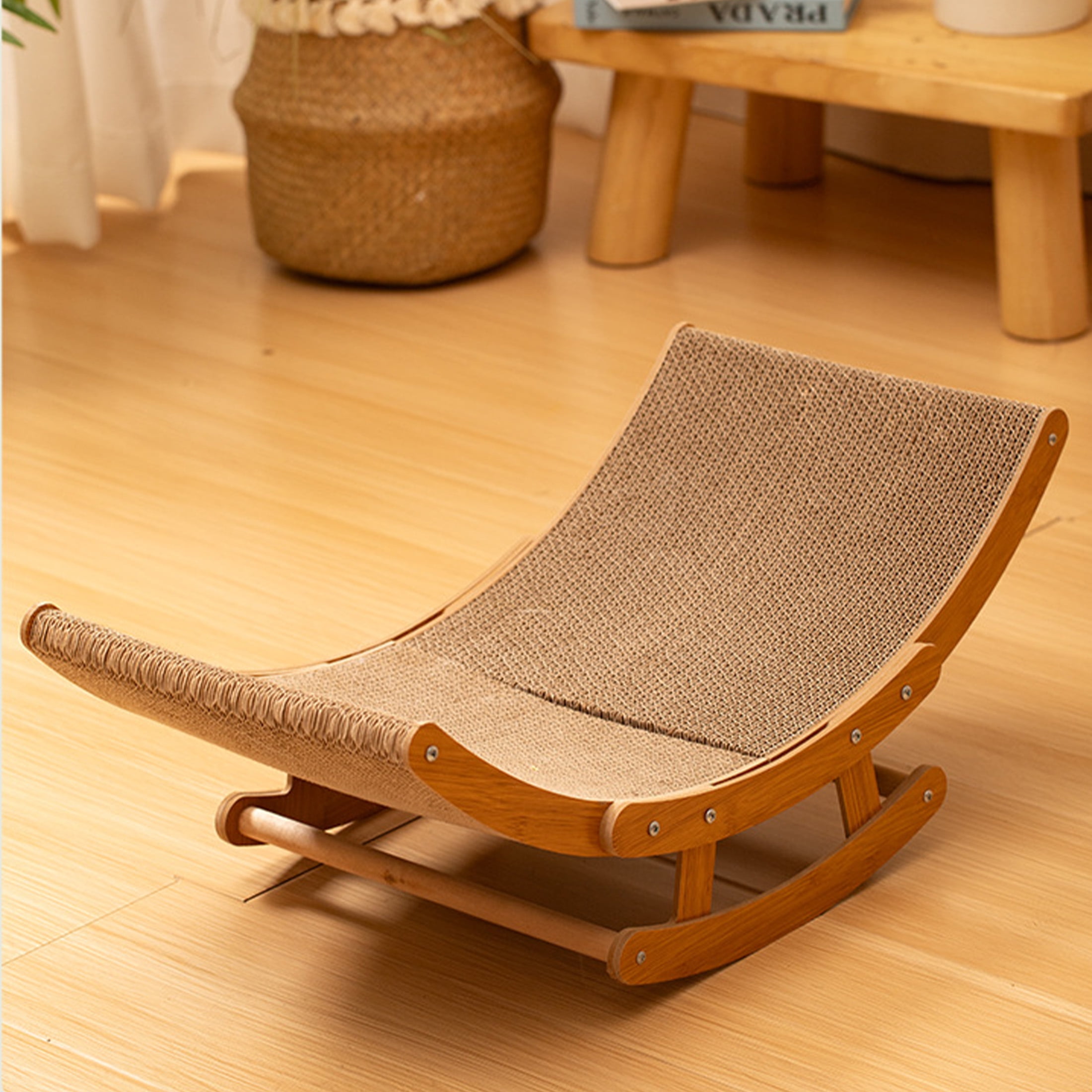 - The cardboard cat scratcher serves as an interactive play toy for cats, keeping them engaged and entertained. The rocking motion of the chair provides a soothing and calming effect on cats, allowing them to relax or sleep while enjoying their scratching session.