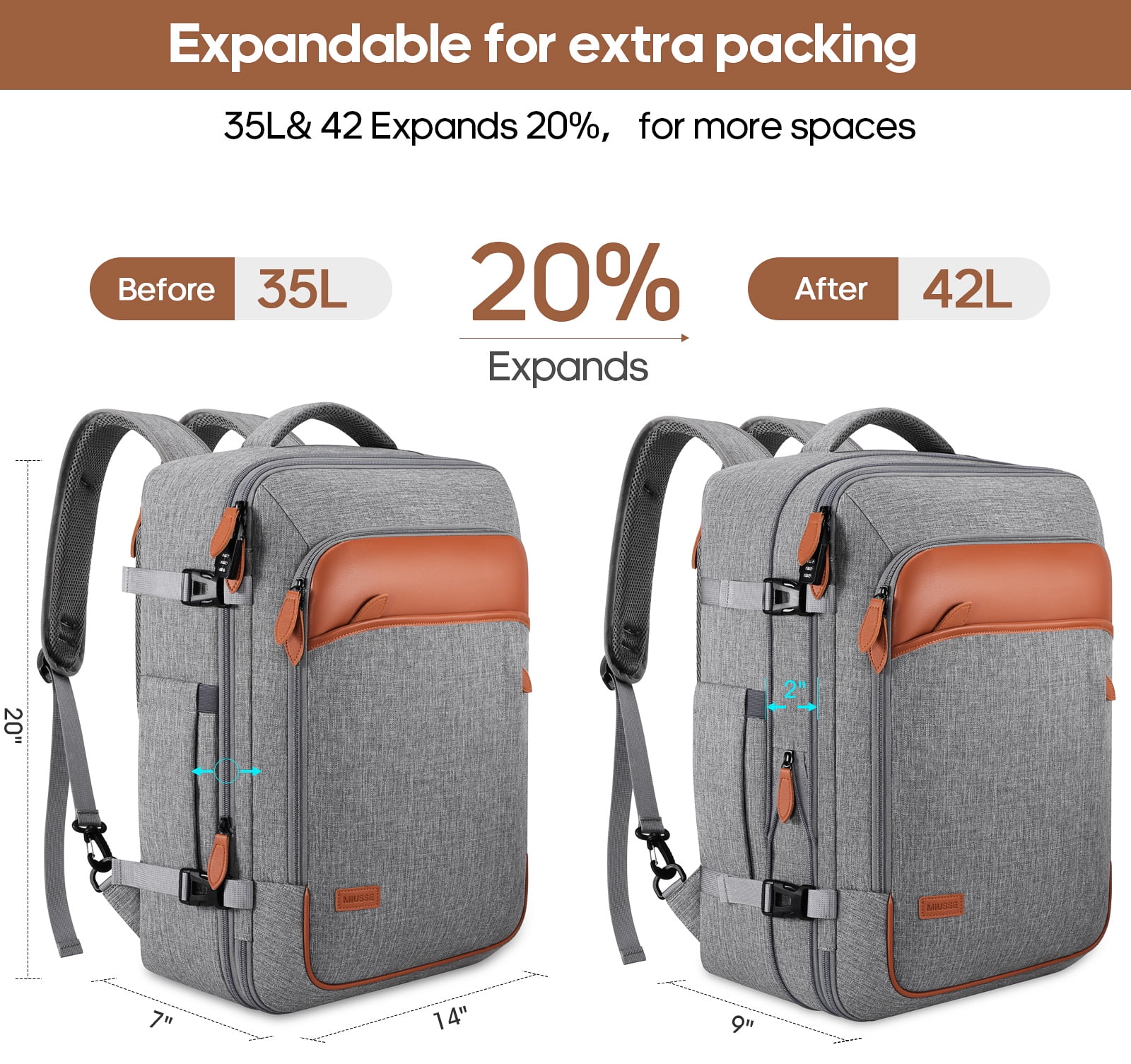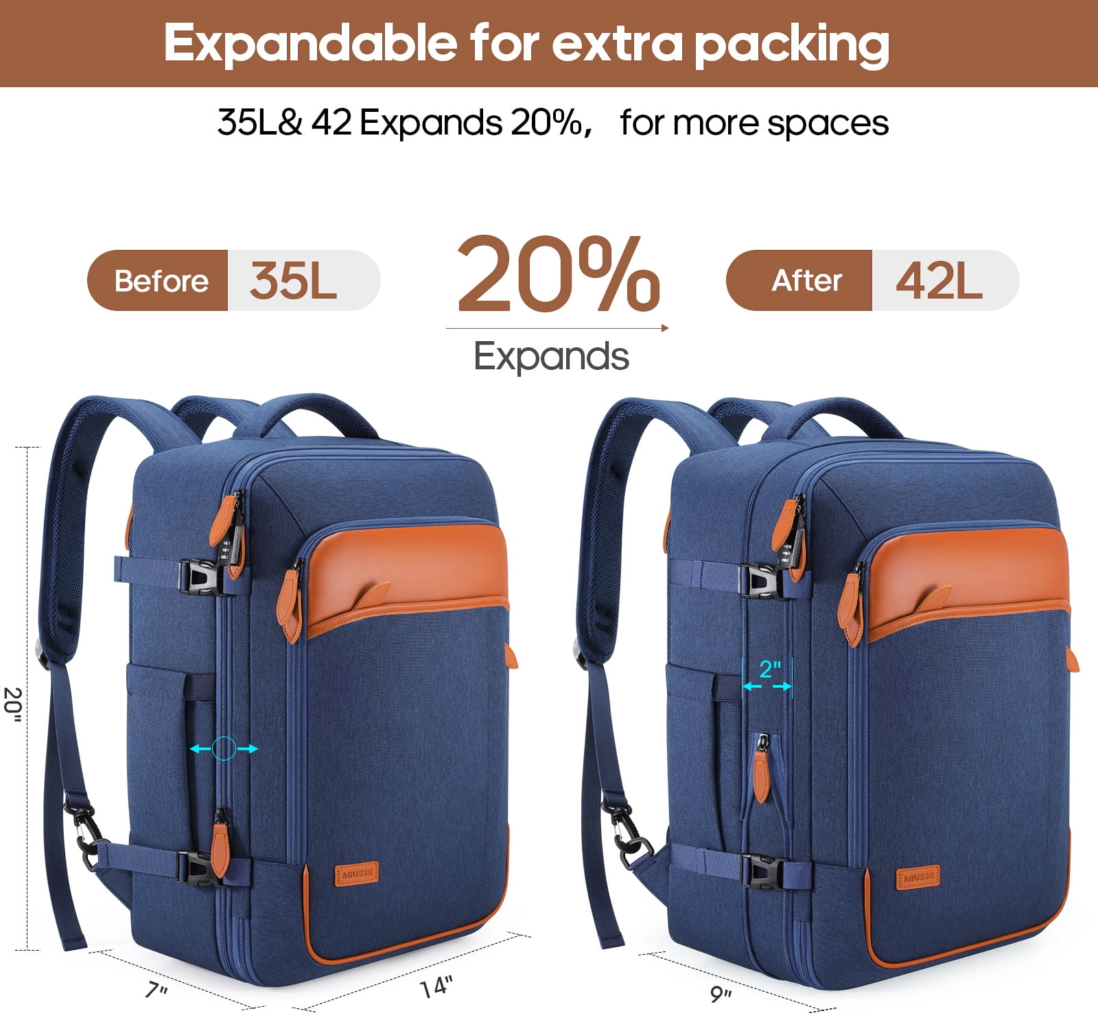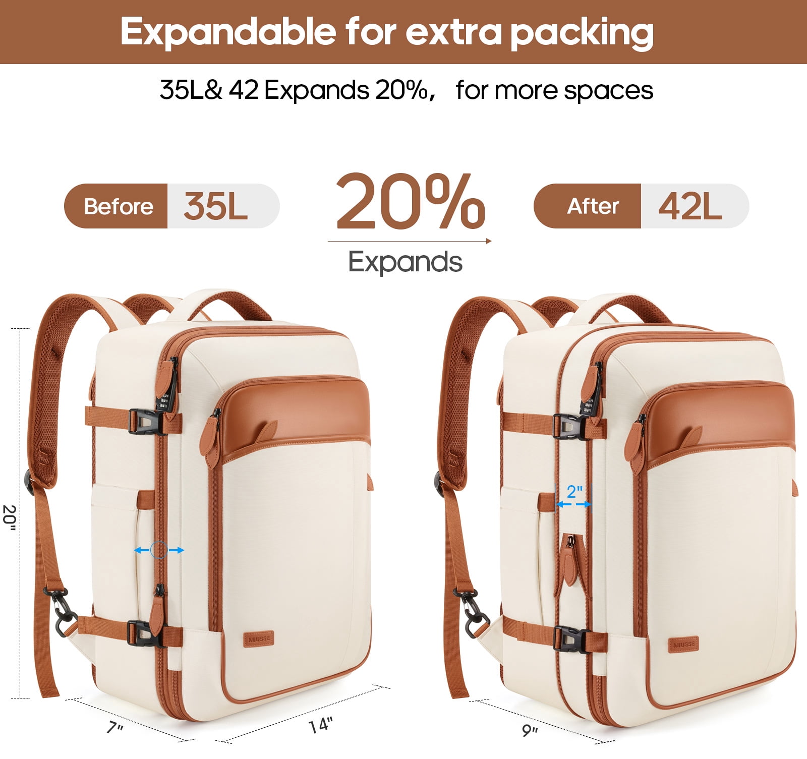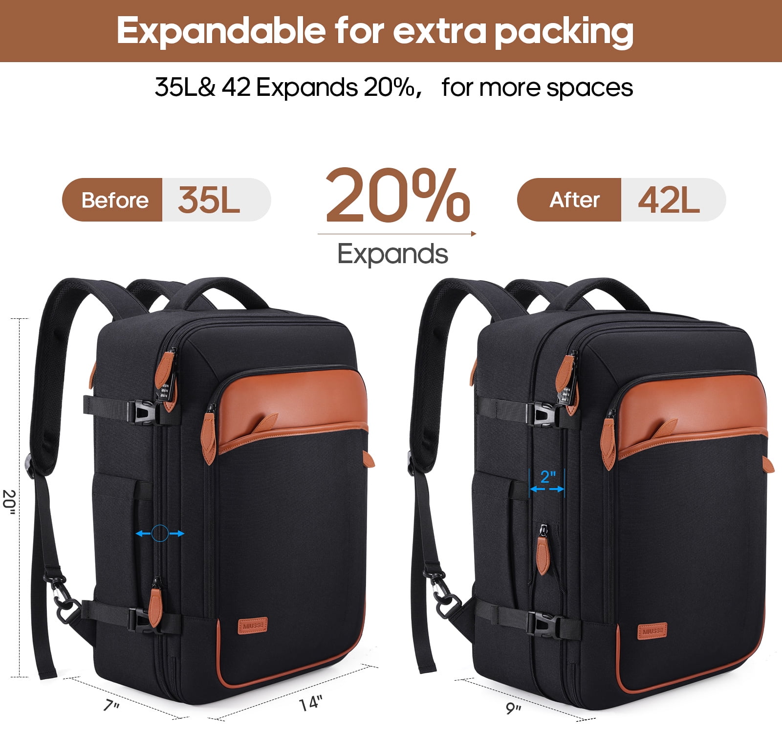 • Spacious Expandable: Features an expandable capacity from 35L to 42L, including multiple pockets, three packing cubes, and a dedicated shoe pocket for organized storage.