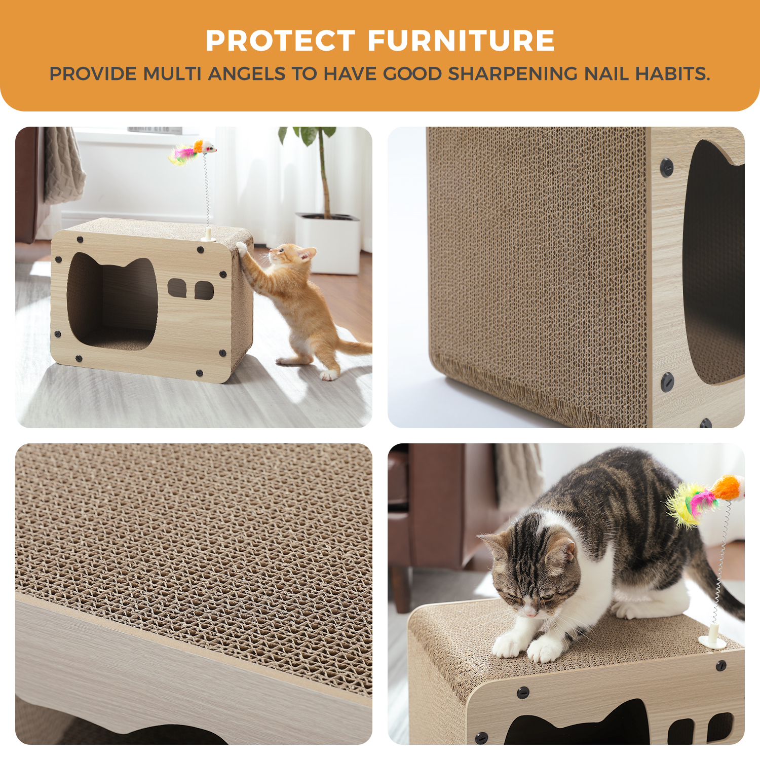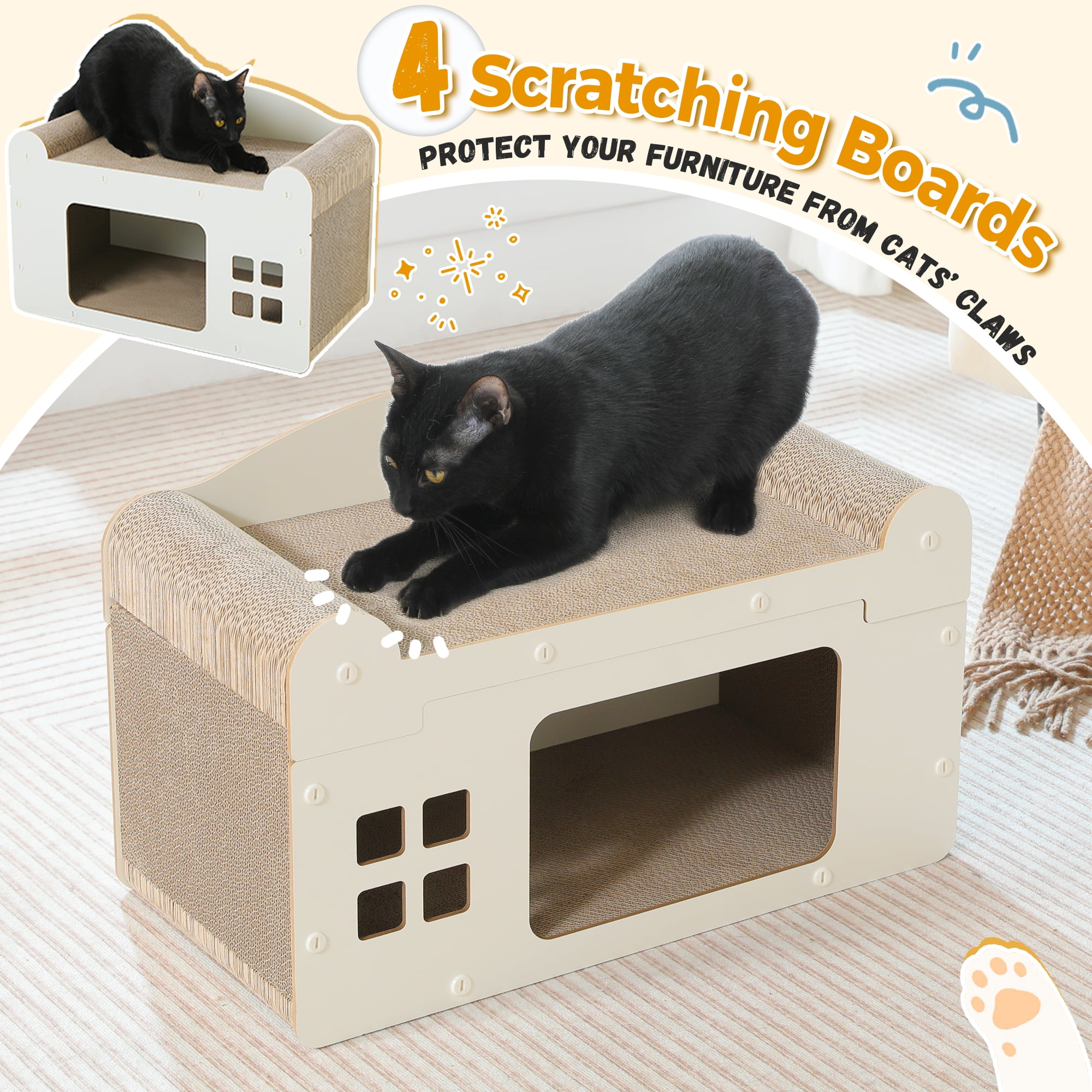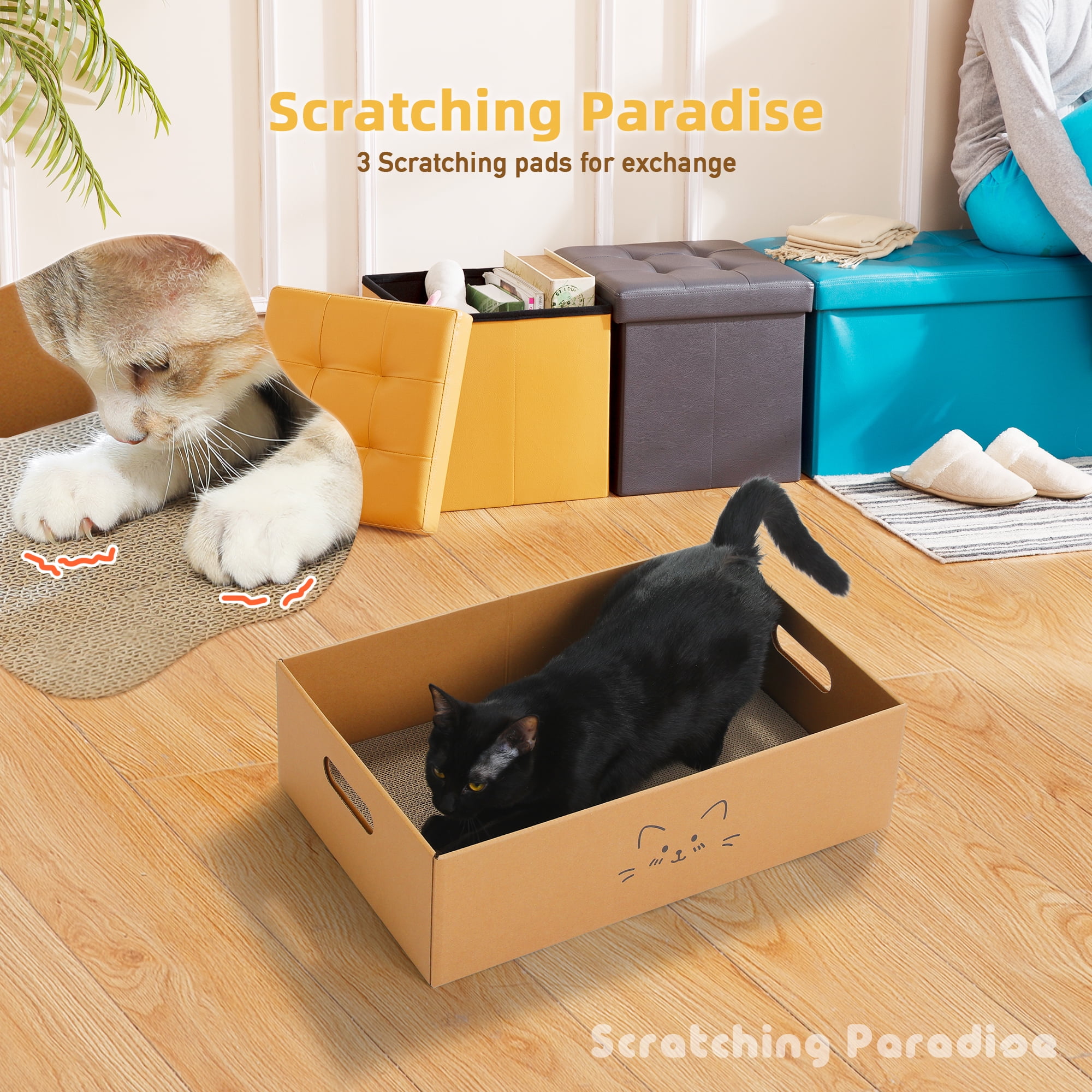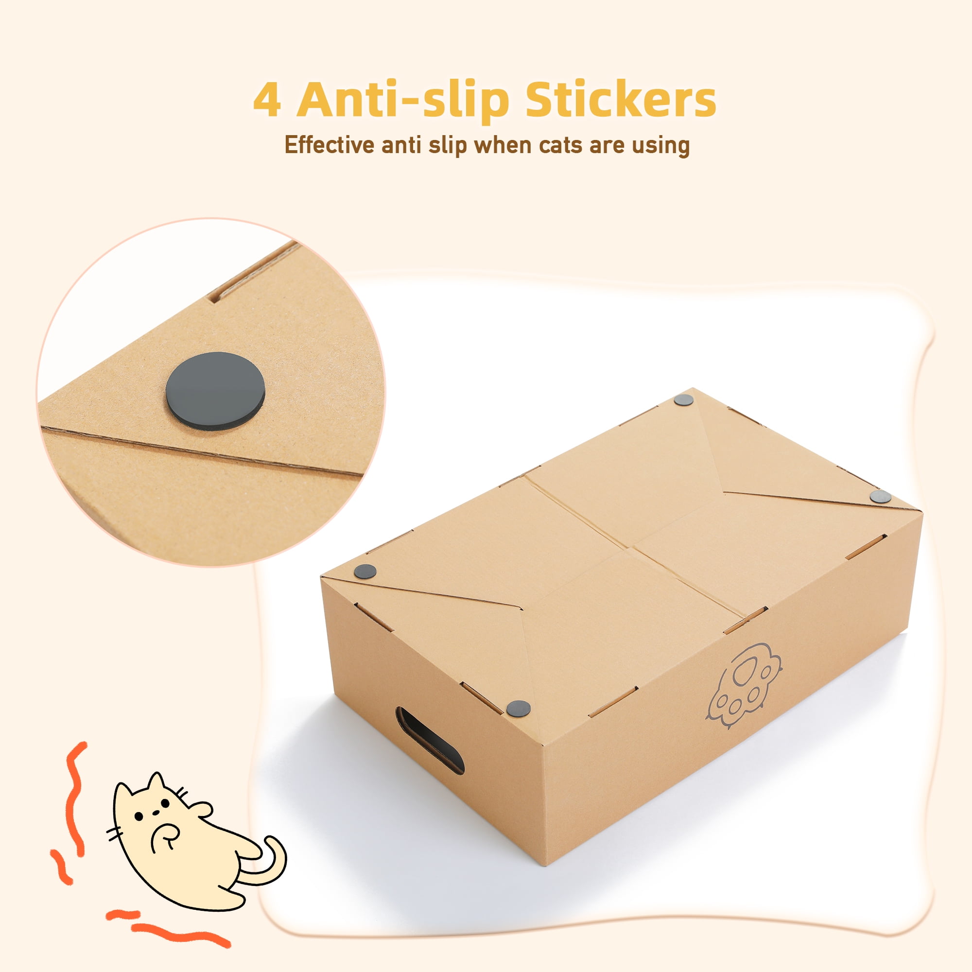 - Helps cats shed old nails and satisfies their natural scratching instinct. Protects your funiture and minimizes debris, as any small paper particles that may occur over time are contained within the box for easy cleaning. The side handles make it convenient to move around.