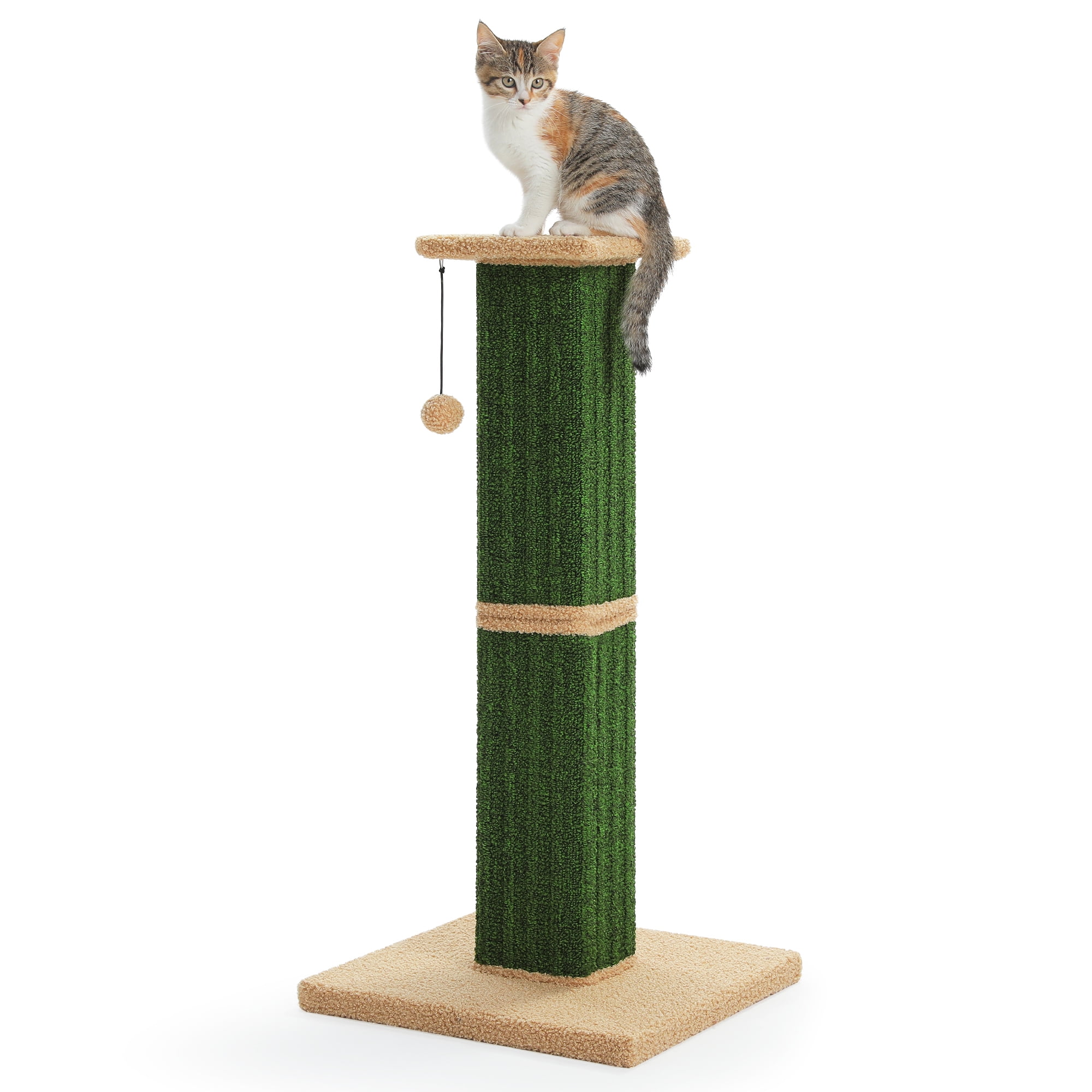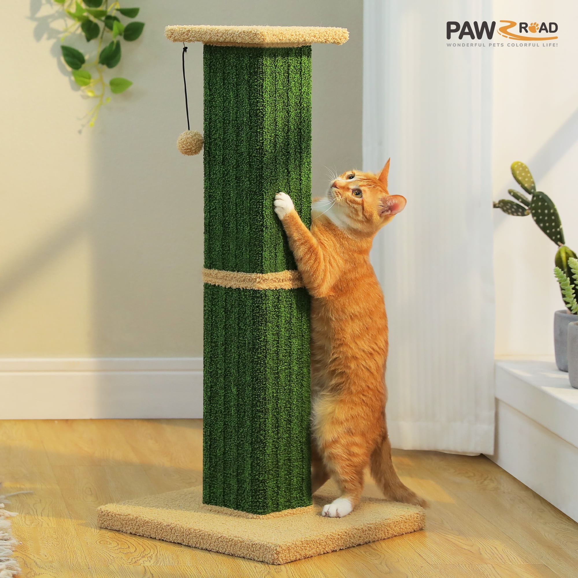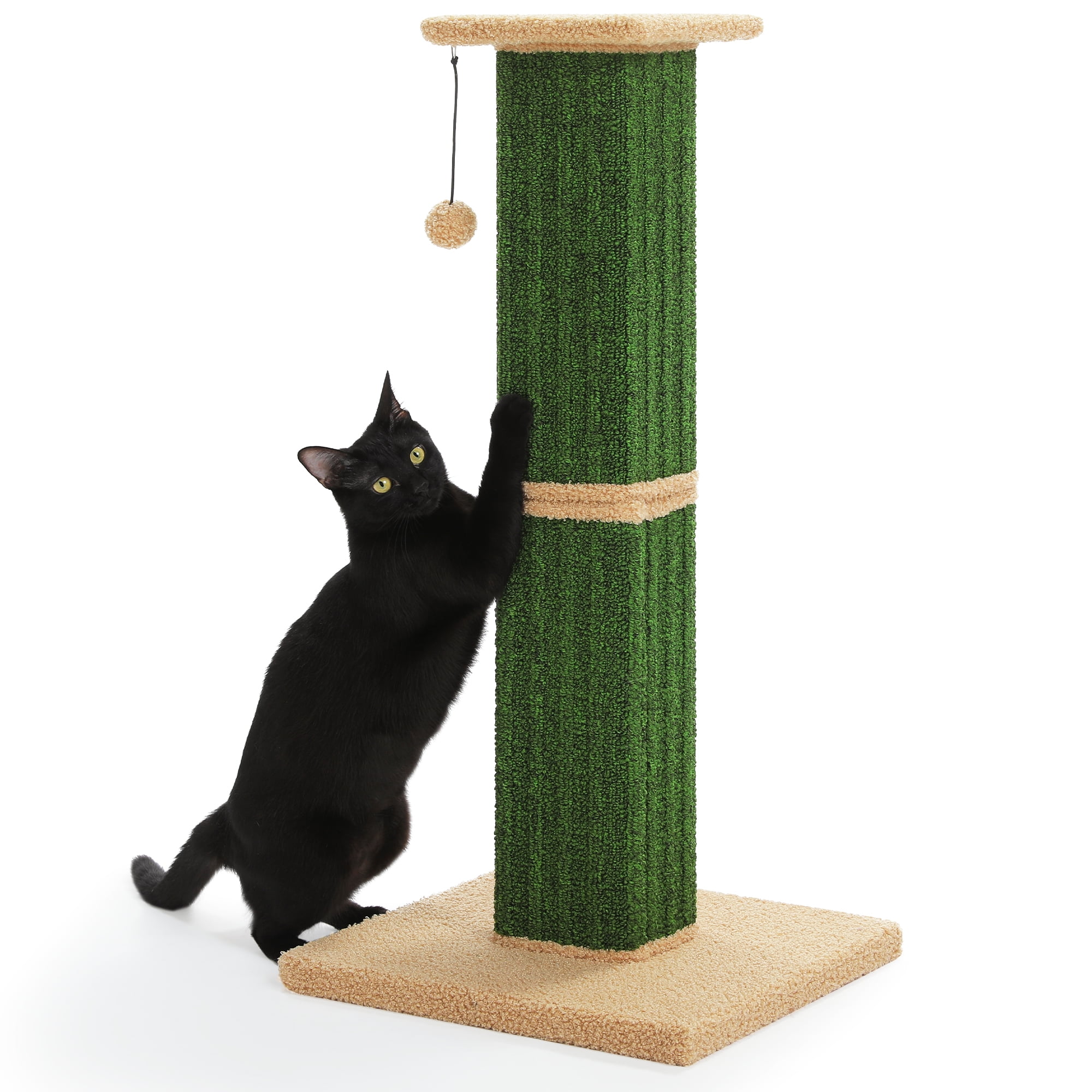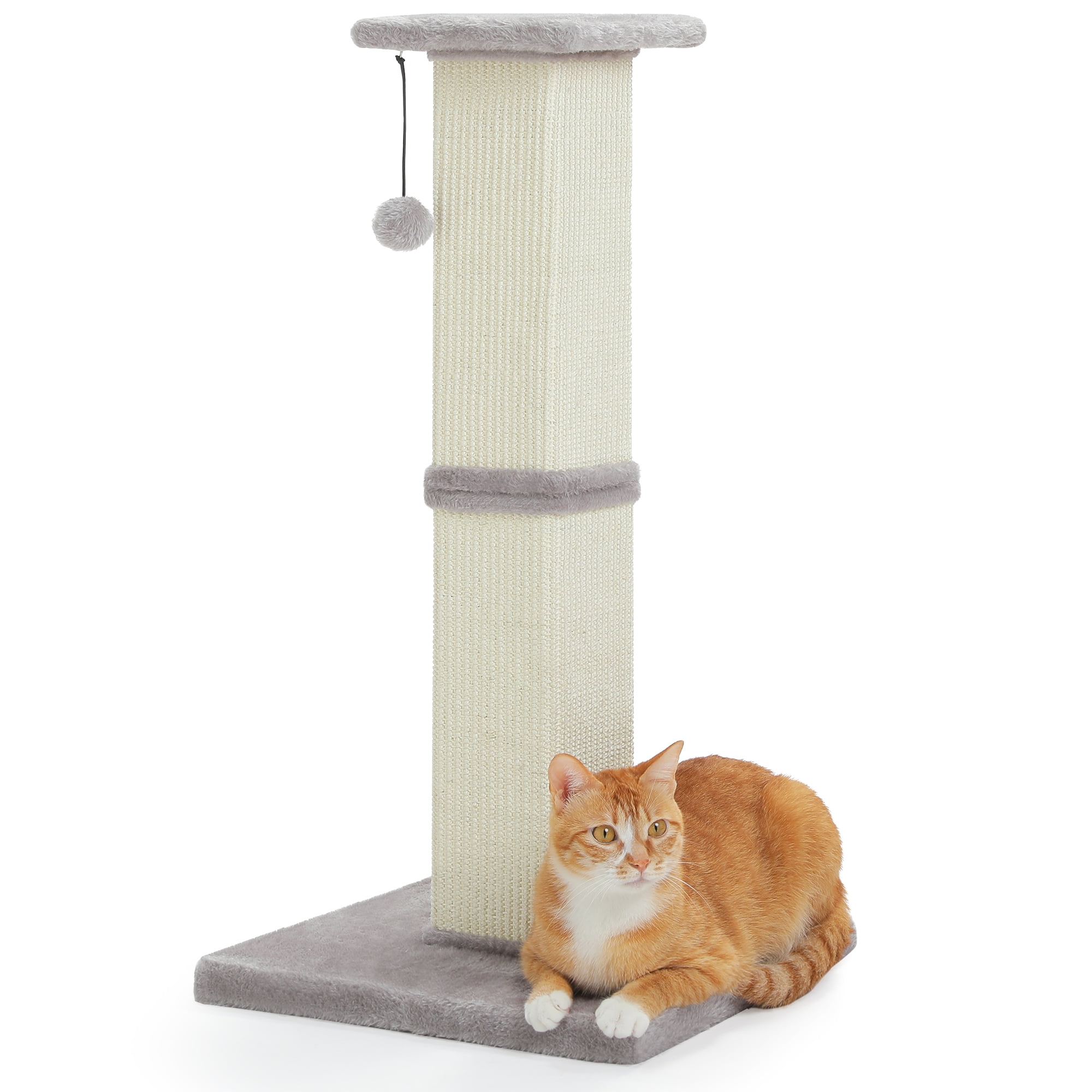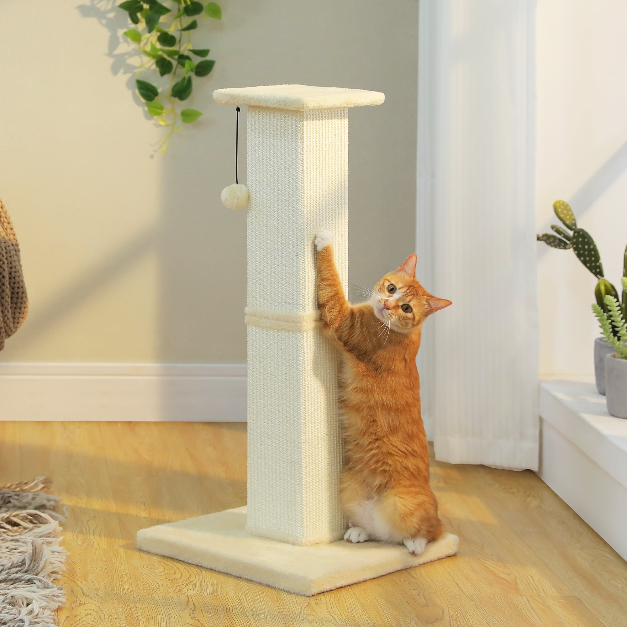 This extra-tall 32″ cat scratcher features a 15″x15″ weighted base for ultimate stability, preventing tipping during vigorous scratching. Wrapped in natural sisal fiber, it satisfies scratching instincts while protecting furniture. The reinforced double-layer core and 4 screws ensure durability, while the bouncy plush ball adds playtime fun. Its sleek design blends with any décor, and 5-minute assembly makes setup effortless. A perfect combo of function and style for happy cats!