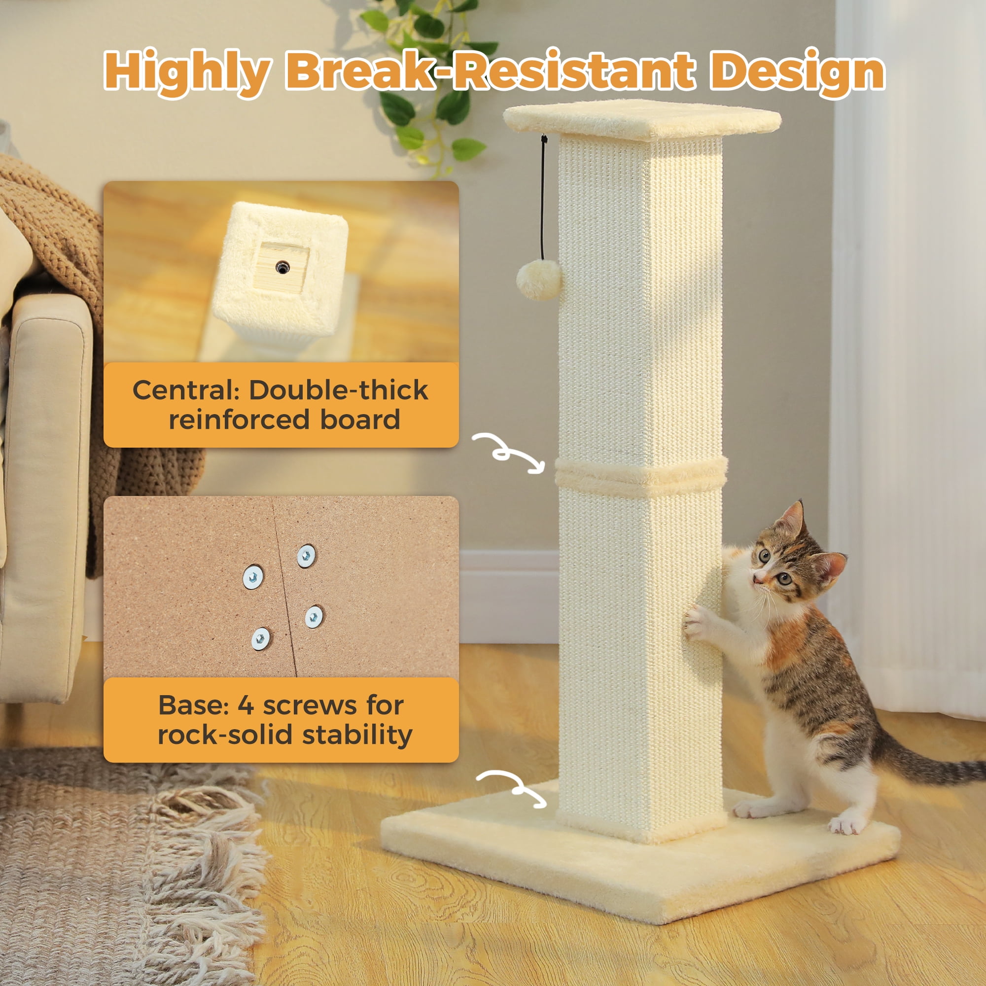 High-quality & durable: Built to endure, this cat scratcher won’t snap thanks to 4 reinforced screws and a double-layer wood core. The robust design prevents mid-column breaks, making it a reliable scratch post for even the most enthusiastic clawing. A stable, long-lasting choice for your feline’s needs.