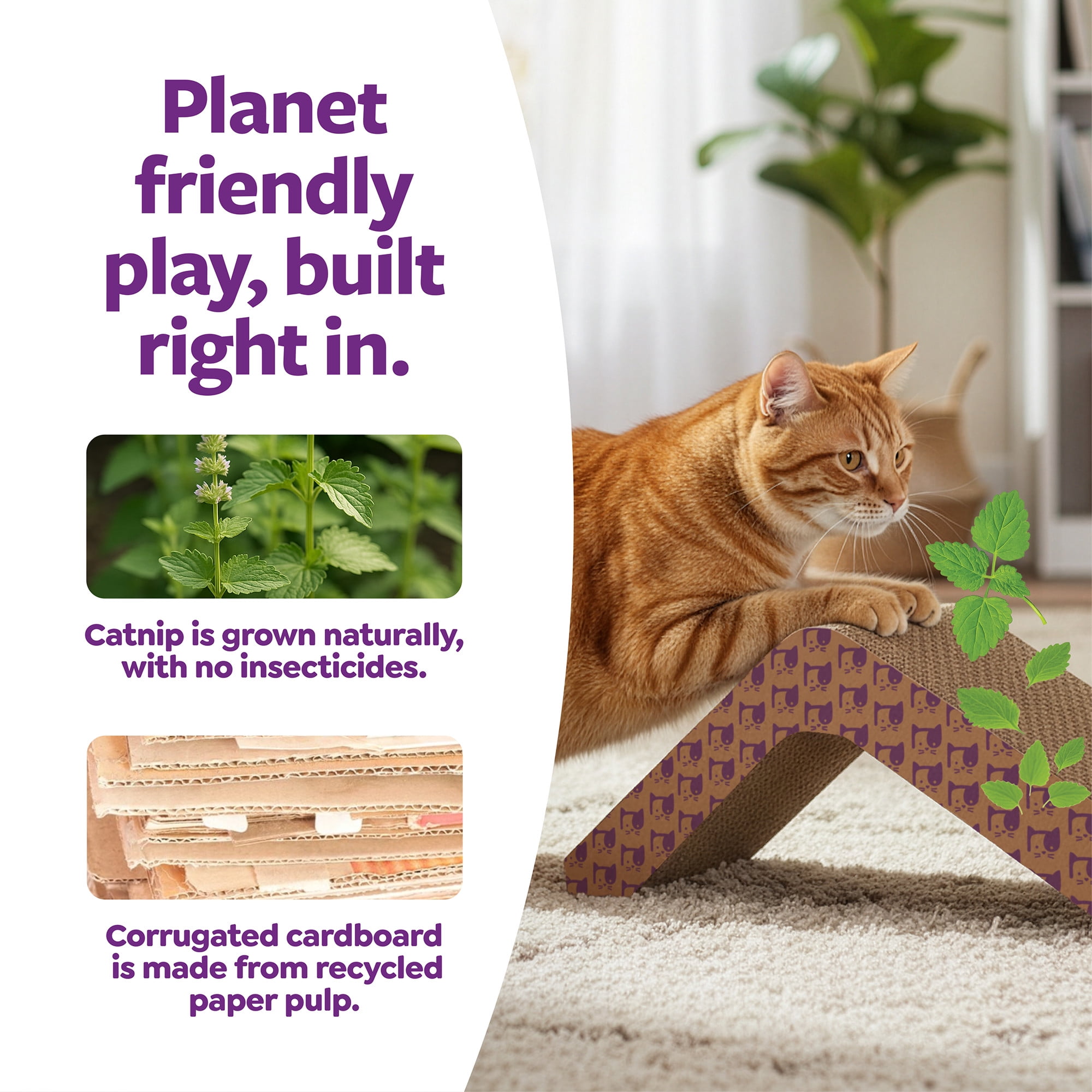- Catnip Infusion Technology: Each layer of corrugate is infused with concentrated catnip, ensuring long-term attraction. The benefits of catnip are released with every scratch, and there’s less mess.